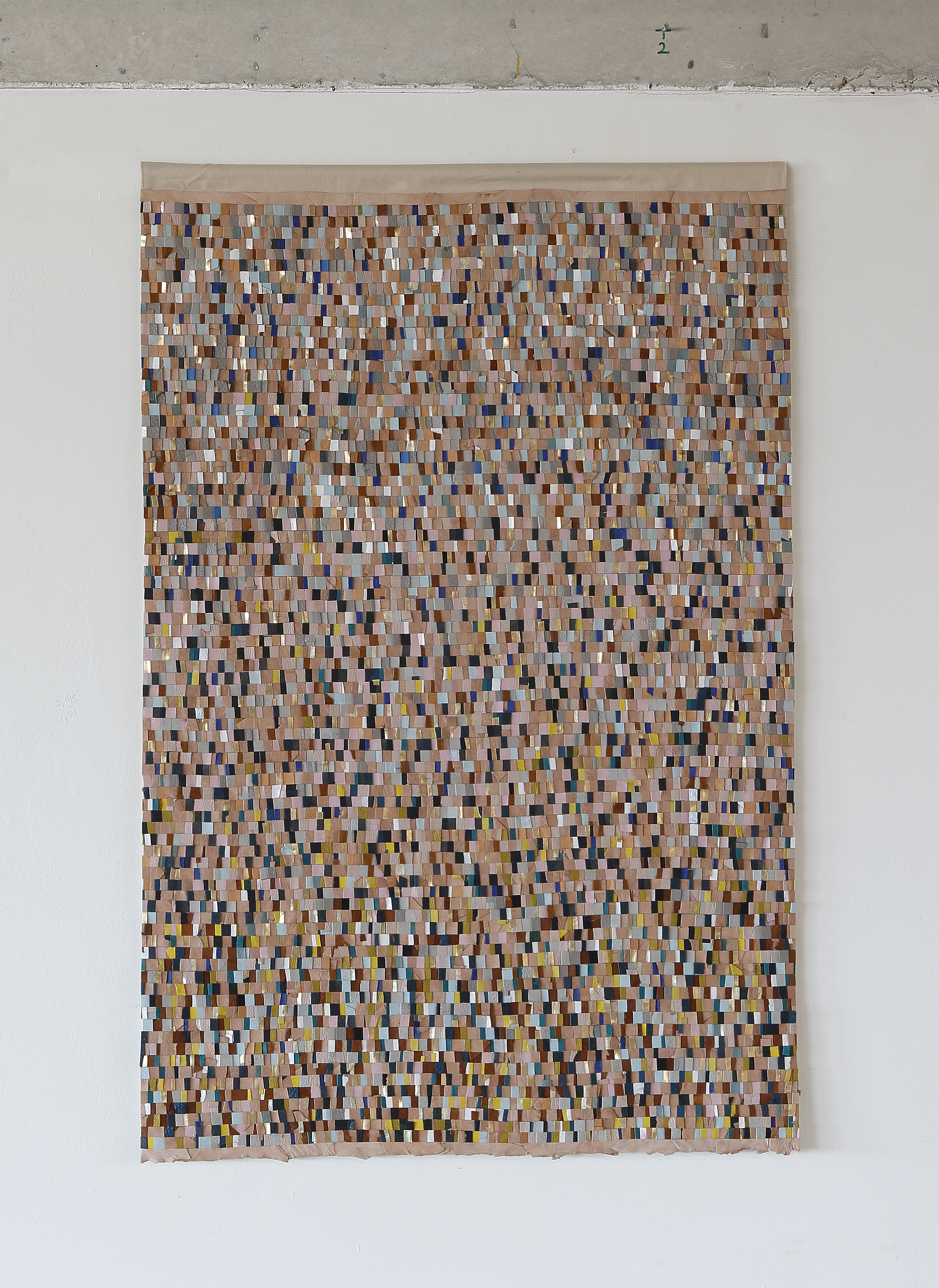 Medina is a technique of creating tapestries from discarded leather leftovers. By embracing the irregular shapes of these scraps, typically considered waste, each Medina tapestry develops a unique, non-repetitive pattern. The inherent imperfections of the leather are celebrated, creating an apparently uniform yet ultimately singular effect, free from repetition. Each individual tapestry created using this method is also known as a Medina.